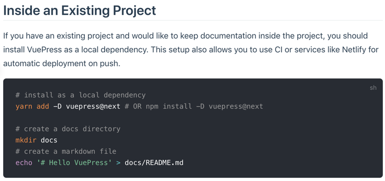 If you have an existing project and would like to keep documentation inside the project, you should install VuePress as a local dependency. This setup also allows you to use CI or services like Netlify for automatic deployment on push.
