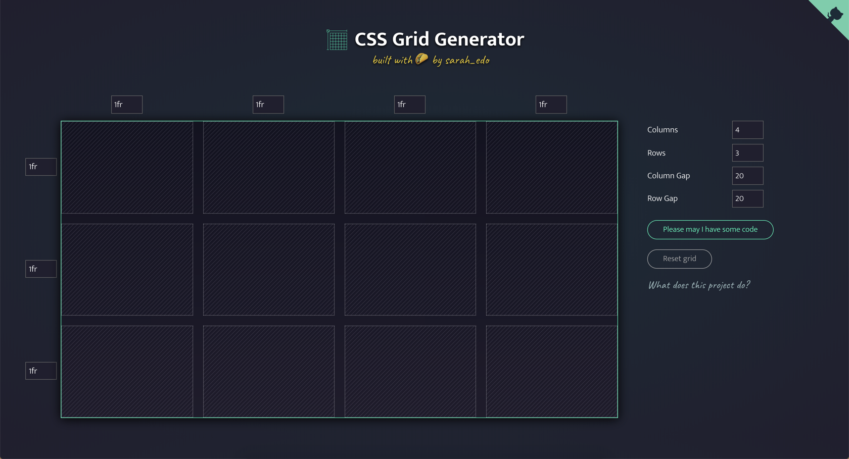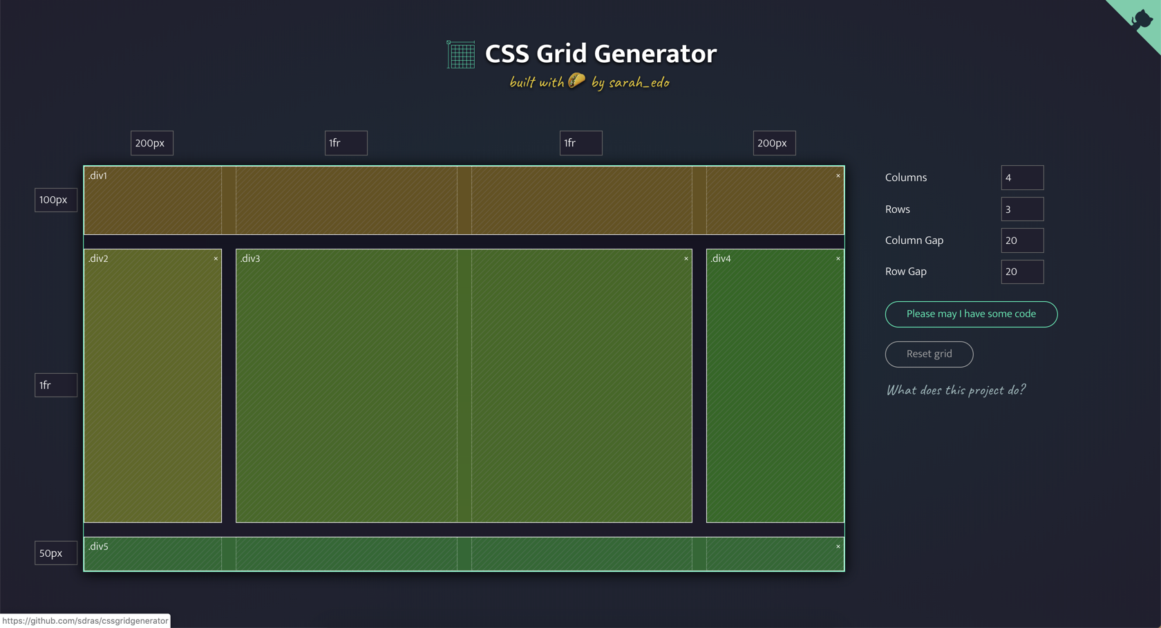 CSS Grid Generator is a free tool created by the super talented Sarah Drasner. It is a visual design tool that allows you to create a basic grid layout and then copy the code that was used to create it. When you first open the tool you will be presented with a default layout but from here you can easily customize the layout to your needs.