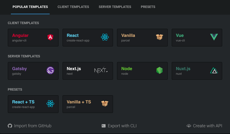 What if you just wanted to check it out and create a new project hassle free? What if you wanted to do this for a number of web projects like React, Vue, Gatsby, Gridsome, VuePress, Next, Nuxt and so on. What if you wanted to use it as a teaching tool where a single concept was more important than the whole story. This is where CodeSandbox comes in and really shines bright.